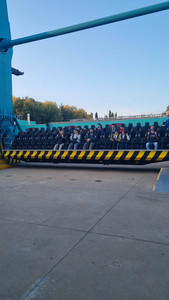 Havia montanhas-russas muito altas. Começámos a explorar o parque um bocadinho até decidir o que íamos fazer primeiro. Aquelas montanhas-russas eram assustadoras. Tínhamos o passe "Correcaminos", então não tínhamos de esperar nas filas. Começámos por uma atração suave, "La Aventura de Scooby-Doo" — era um género de carrinho que andava dentro de uma casa e tínhamos que disparar contra as coisas sinalizadas com verde.